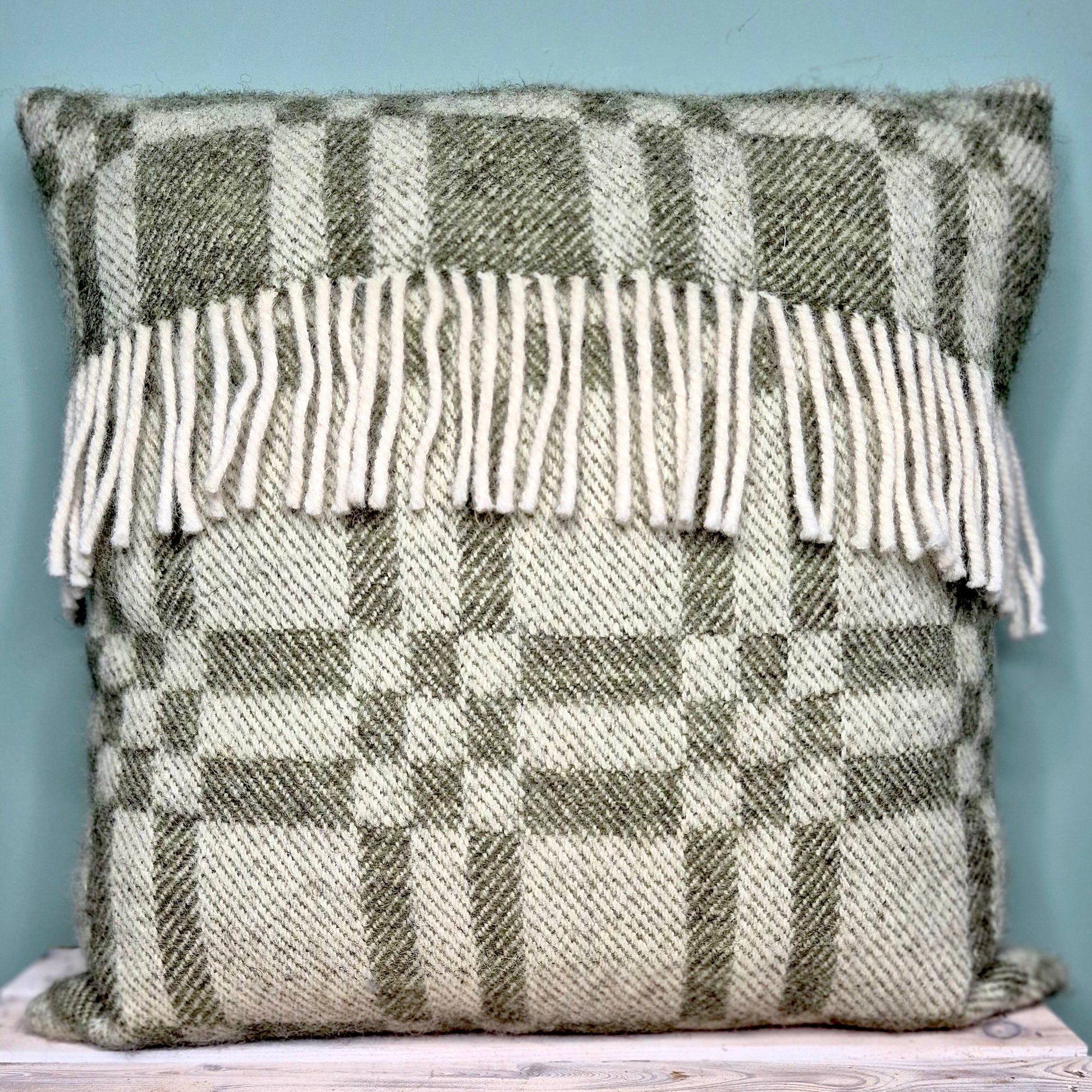 Pure Wool Cushion | Moss Green Geometric w/Fringe