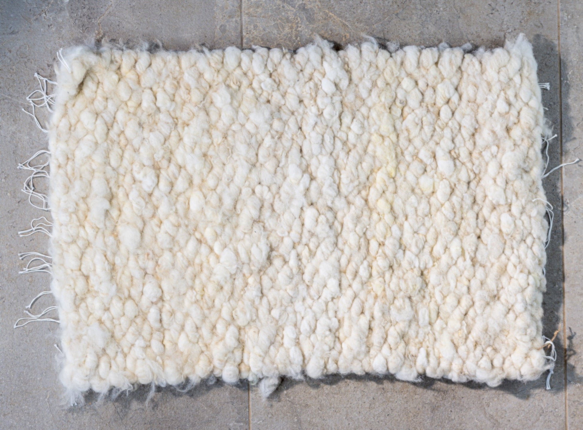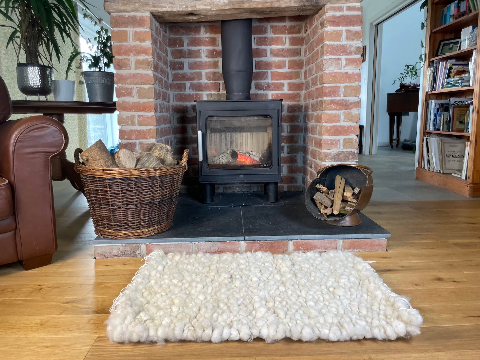 The wool comes from our Salcombe farm's Devon Closewool sheep. These sheep produce particularly soft, bright wool with a natural cream colour. Each rug carries the specific characteristics of this traditional Devon breed, with the natural fleece texture preserved throughout the process.